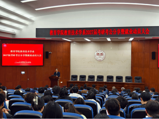 此次分享暨动员大会,既是对 2026 届深造成果的集中展示,也是对 2027 届学子的精准赋能。近年来,教育学院教育技术学系坚持以学生为中心,构建全程化、个性化、精准化的升学就业指导体系,通过专题辅导、经验分享、一对一答疑、模拟复试等举措,持续提升人才培养质量,推动考研深造率与就业质量稳步攀升,为新时代教育技术领域输送了一批高素质应用型人才。